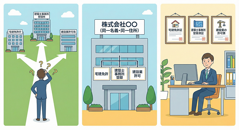 宅建士、建築士、建設業許可。これらの資格や許可は、不動産業や建設業に携わる上で重要なものです。しかし、同じ住所や名義でこれらの全てを取得できるのでしょうか?本記事では、それぞれの資格・許可の要件を整理し、同一名義・住所での取得の可否、注意点について解説します。